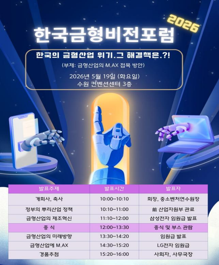 급변하는 글로벌 제조 환경 속에서 국내 금형 산업이 마주한 기술적 한계를 극복하고, 새로운 도약의 발판을 마련하고자 당사가 오는 5월 19일 수원컨벤션센터에서 개최되는 ‘한국금형비전포럼 2026’에 GOLD 후원사로 전격 참여합니다.